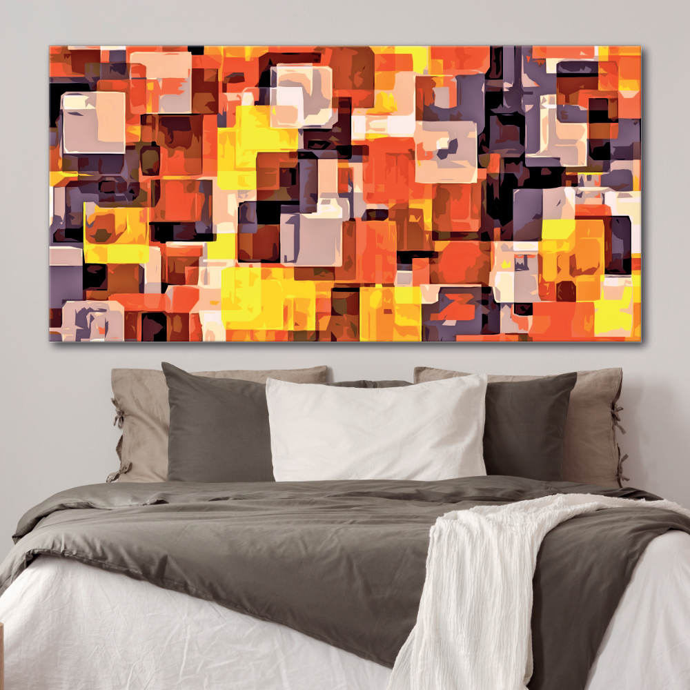 Dit “Oranje Abstract Patroon Schilderij” is een voorstelling van moderne kunst. Het heeft vierkante patronen met overheersende kleuren zoals rood en oranje met een vleugje geel. Inderdaad, dit moderne kunstschilderij is een abstract schilderij met geometrische vormen, origineel en eigentijds, dat u aan de muur van uw woonkamer kunt hangen en ook in andere kamers van uw keuze.