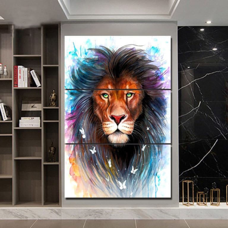 Met dit schilderij zullen uw muren worden verlicht door de intense kleuren van deze leeuw waar zijn manen kleuren afgeven.