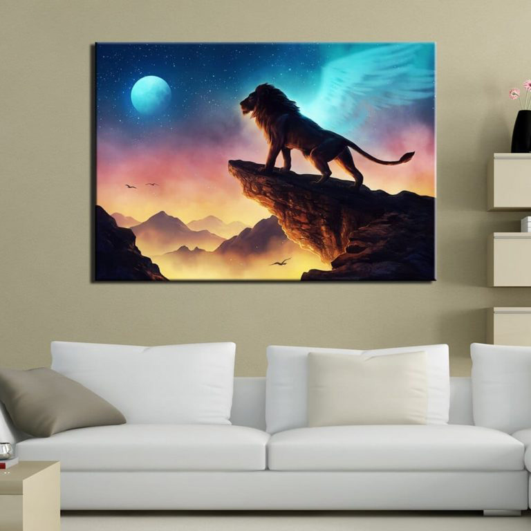 Deze leeuw met wolkenvleugels neemt je mee naar een andere dimensie. Uw interieur zal nog nooit zo mooi zijn geweest met deze leeuw en dit meest indrukwekkende landschap.