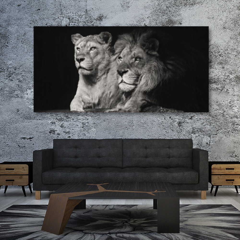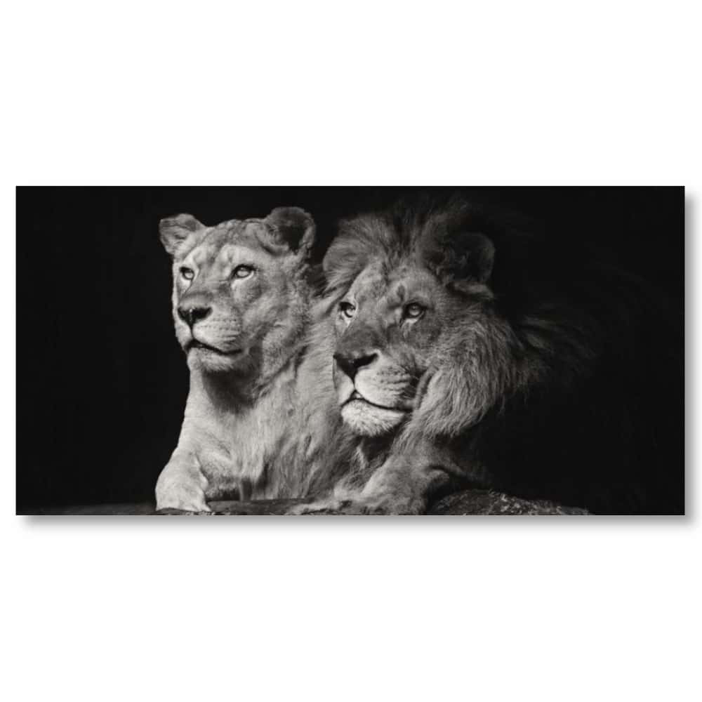 Schilderij met een afbeelding van een leeuw en leeuwin zwart-wit – Canvas afdrukken