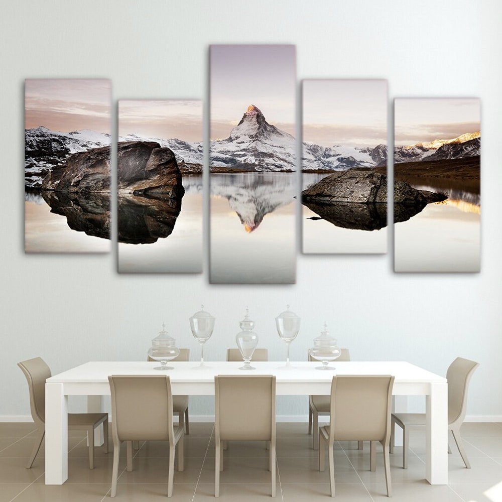 Deze berg heeft als een gouden piek, verlicht door de zon, het meer is helder en weerspiegelt alle elementen perfect. Een perfect plaatje dat een luxueus tintje aan uw decoratie zal geven.