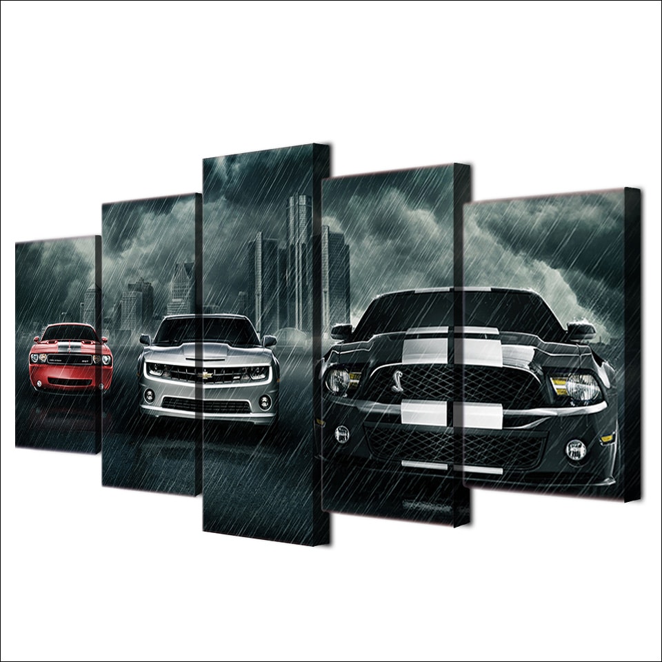 Hoor het “plic ploc” van de regen die op deze raceauto’s valt. Het natte, glanzende, schone dak en motorkap rollen over de weg. Het geluid van de banden die over de regen rollen en de waterdruppels op de ruiten. Voel de sensaties van dit schilderij.